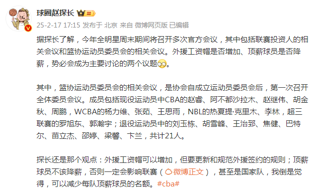 媒体东谈主赵探长显露,2月28日-3月2日在吉林长春举办的CBA全明星周末技巧,将召开一些会议,其中包括CBA投资东谈主的会议和篮协通顺员委员会的会议。值得一提的是,这是篮协确立通顺员委员会后第一次召开整体委员会议。